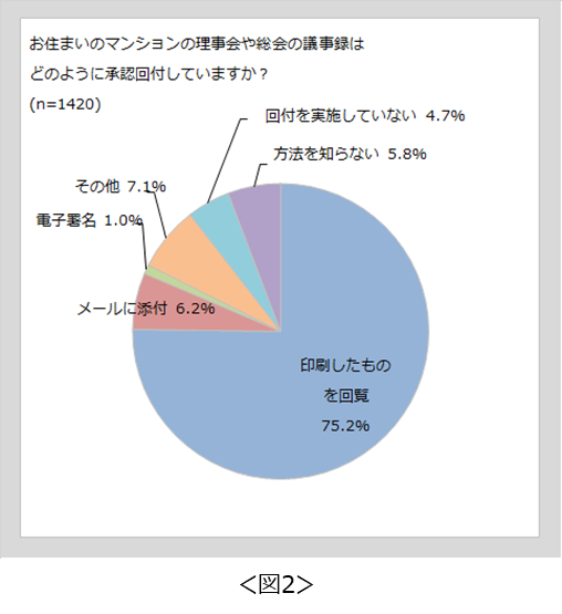 マンション管理組合においては、理事会等の議事録は「印刷したものを承認回付する」と回答した理事会役員経験者が約75%(図2参照)。書面での運用が主流な中、承認までに時間がかかること、過去の議事録の閲覧が困難なことなど、現状に対する不満の声があがりました。
