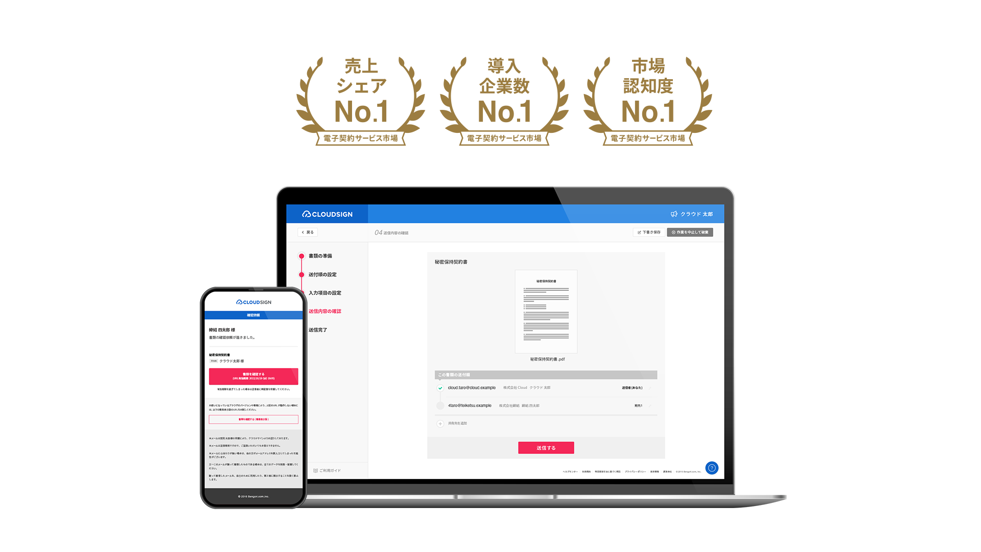 2022年7月に発表された富士キメラ総研調査によると、クラウドサインは電子契約ツール市場の主要5社の中で、国内売上高のシェアNo.1を獲得しました。また、2022年7〜8月に実施したクラウドサイン電子契約総合研究所(以下、クラウドサイン総研)が外部調査機関に委託した調査では、昨年に引き続き、国内契約送信件数、認知度調査においてもNo.1という結果となりました。