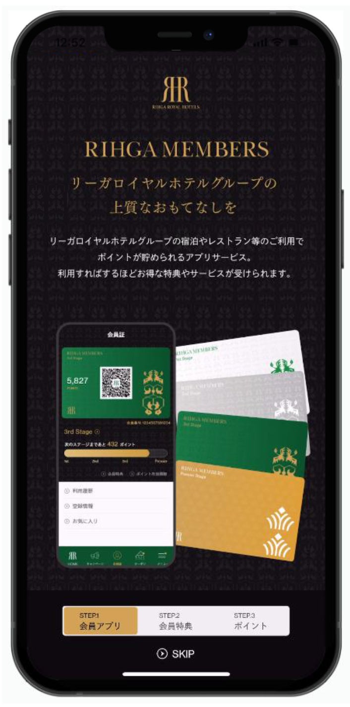 グループ全12ホテル※の宿泊やレストラン、オンラインショップ等の利用でポイントが貯まり、利用すればするほどお得な特典やサービスを受けられる「リーガメンバーズ」。アプリでは、ホテルの宿泊やレストランを簡単に予約できるほか、お得なクーポン、特別宿泊プラン、レストラン特別メニューなどのキャンペーン情報を定期的に受け取れ、利用回数に応じて特典を受けられるスタンプラリー(カード)機能も。よりお得に、より楽しく、よりスマートにホテルをご利用いただけます。