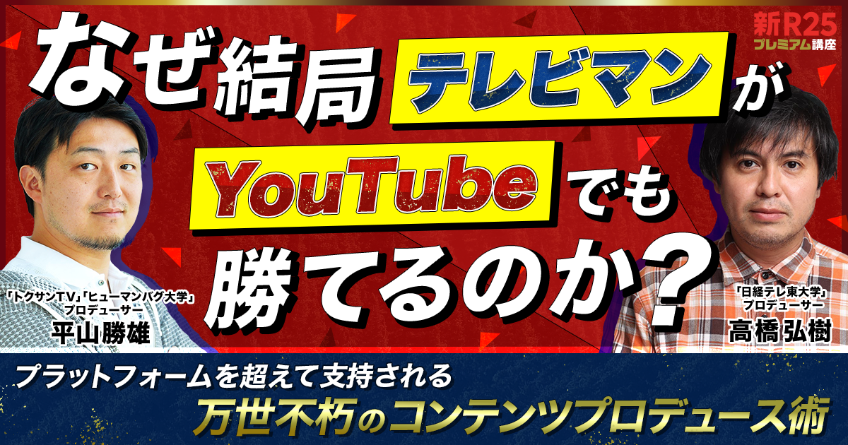 本日公開した「なぜ結局テレビマンがYouTubeでも勝てるのか? 〜プラットフォームを超えて支持される万世不朽のコンテンツプロデュース術〜」では、“テレビでもネットでも成功したプロデューサー”として、「トクサンTV」「ヒューマンバグ大学」などのプロデュースを手がける平山勝雄さんと、「日経テレ東大学」を立ち上げた高橋弘樹さんをゲストに迎え、情報爆発時代を勝ち抜くためのコンテンツプロデュース術から動画制作の具体的フローまで、新R25編集長の渡辺が徹底的に深堀りします。