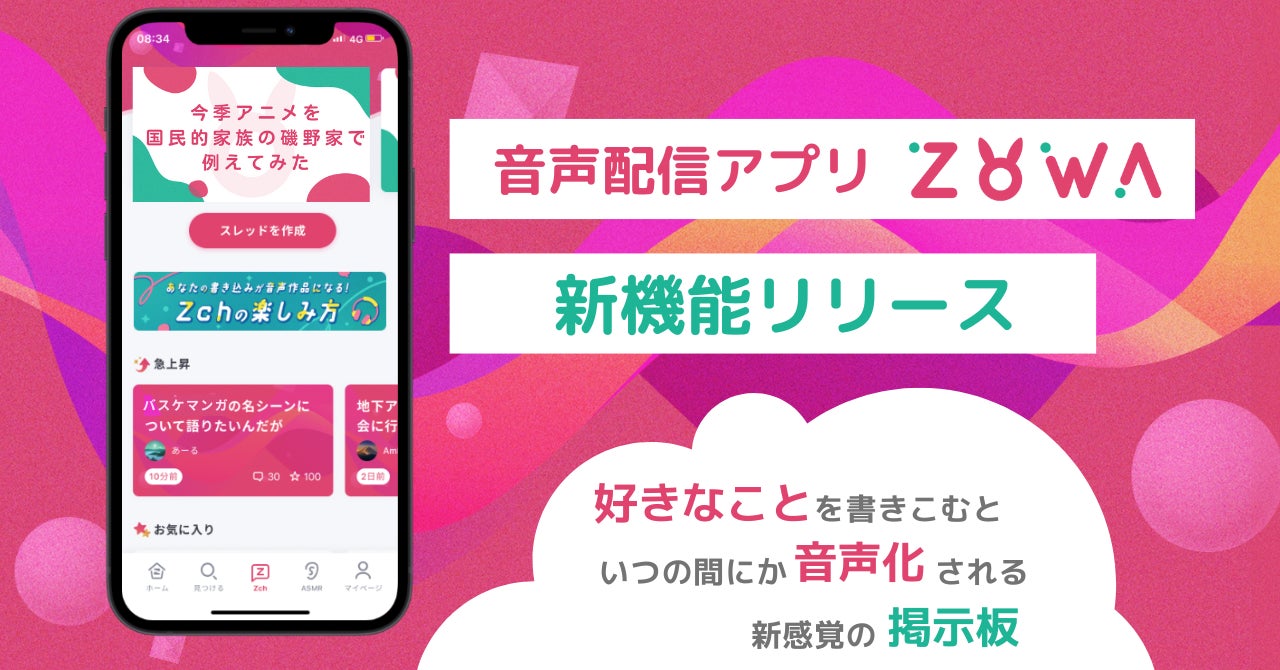 『ZOWA』ボイスドラマや音声による番組などの「エンタメ系音声作品」と、「ASMR動画作品」の両方を楽しめる音声に特化した配信サービス。
