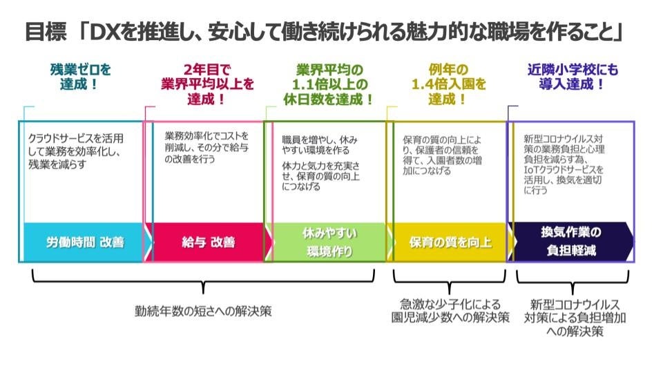 職員に対しては、残業ゼロの実現、業界平均以上の給与支給、業界平均の1.1倍以上の休日数を実現しています。また、2022年の入園者数は例年の1.4倍を実現することができました。さらに新型コロナウイルス対策におけるIoT機器の活用は、同園の工数削減だけでなく、近隣小学校にも導入が決まるなど、DX推進を地域にも広げることができました。