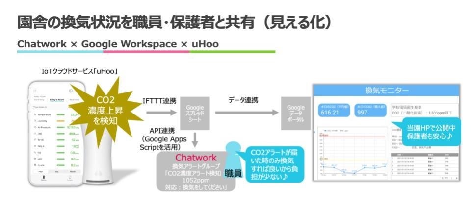 ・新型コロナウイルス対策として、換気状況をCO2濃度で計測できるIoTクラウドサービス「uHoo(ユーフー)」を利用し、園舎の換気状況が悪化した際に「Chatwork」にアラートを自動送信する仕組みを構築。CO2濃度の計測データは「Googleデータポータル」を利用してホームページで開示