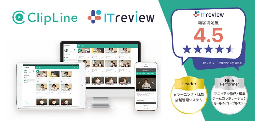 コロナ禍以降、研修・教育領域において多くのITツールが躍進する中で、特にClipLineの優位性として評価されてきた項目の中に「顧客満足度」があります。当社は『「できる」をふやす』をミッションに掲げ、顧客企業の成果創出に伴走することを特徴としており、サービス業の支援に多くの知見を持つプロフェショナルチームが一丸となって導入から活用定着までサポートします。この顧客目線で行う、高品質できめ細かなサポートが評価され、このたびの称号および顧客満足度4.5(5点満点中)の獲得に至りました。