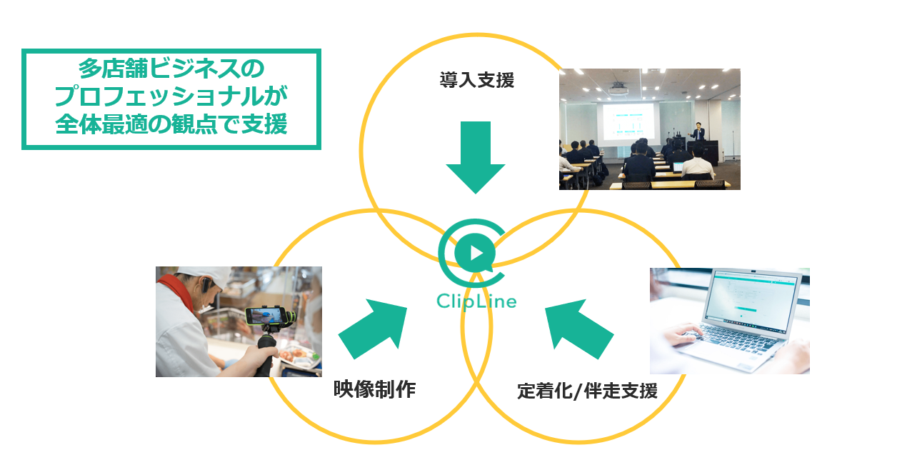 ClipLineは30秒から1分程度の短尺動画を使って、多店舗・多拠点を展開するビジネスの生産性を向上させるプロダクトです。本部から店舗への業務指示、店舗から本部への業務報告、マネージャーと店舗スタッフのコミュニケーション、店舗ノウハウの水平展開、スタッフの新人教育・スキルアップなどに貢献し、売上増、人件費削減、離職率削減などの財務効果を創出します。