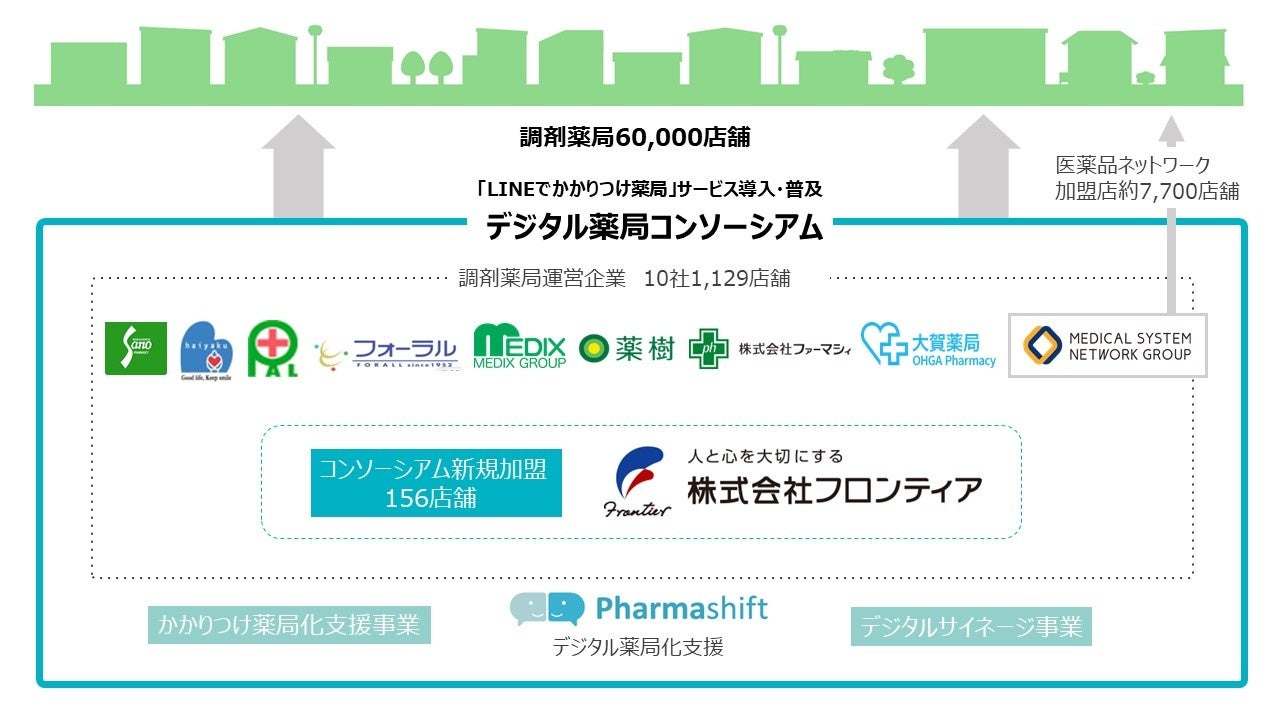 近畿・関東エリアを中心に全国各地に156店舗を展開するフロンティア薬局は、薬局が必要とする機能をオールインワンで有していること、また、9,200万ユーザーを誇る「LINE」を利用した本サービスが患者・薬局双方の利用促進を期待できることから、「つながる薬局」の導入を決定されました。加えて、「デジダル薬局コンソーシアム」に参画いただくことで、「かかりつけ薬局化」の推進をともにすすめてまいります。