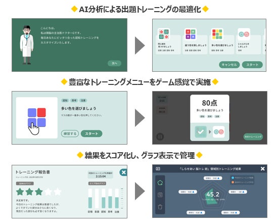 認知症予防に向けたトレーニングのアプリケーションとして、地方自治体や介護施設向けに展開しているサービスです。神経内科専門医と共同開発したAIでの分析により、ユーザーごとに最適なトレーニングメニューを提供することで、専門医が付いていなくても効率的な認知症早期予防に向けたトレーニングが実施できます。