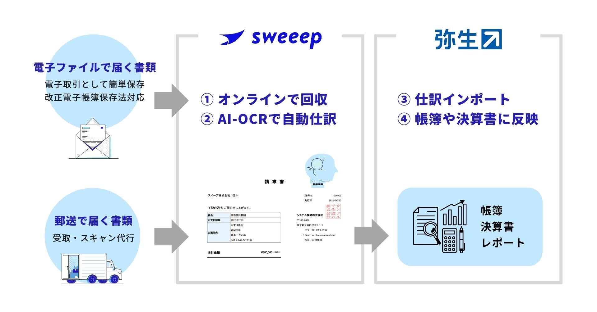 本取り組みにより、「sweeep Invoice」で受領した請求書の仕訳データを弥生の会計ソフトウェアに連携することができます。手入力で仕訳登録をする必要がなくなり、経理業務にかかる一連のプロセスをシームレスにデジタル化することが可能になります。