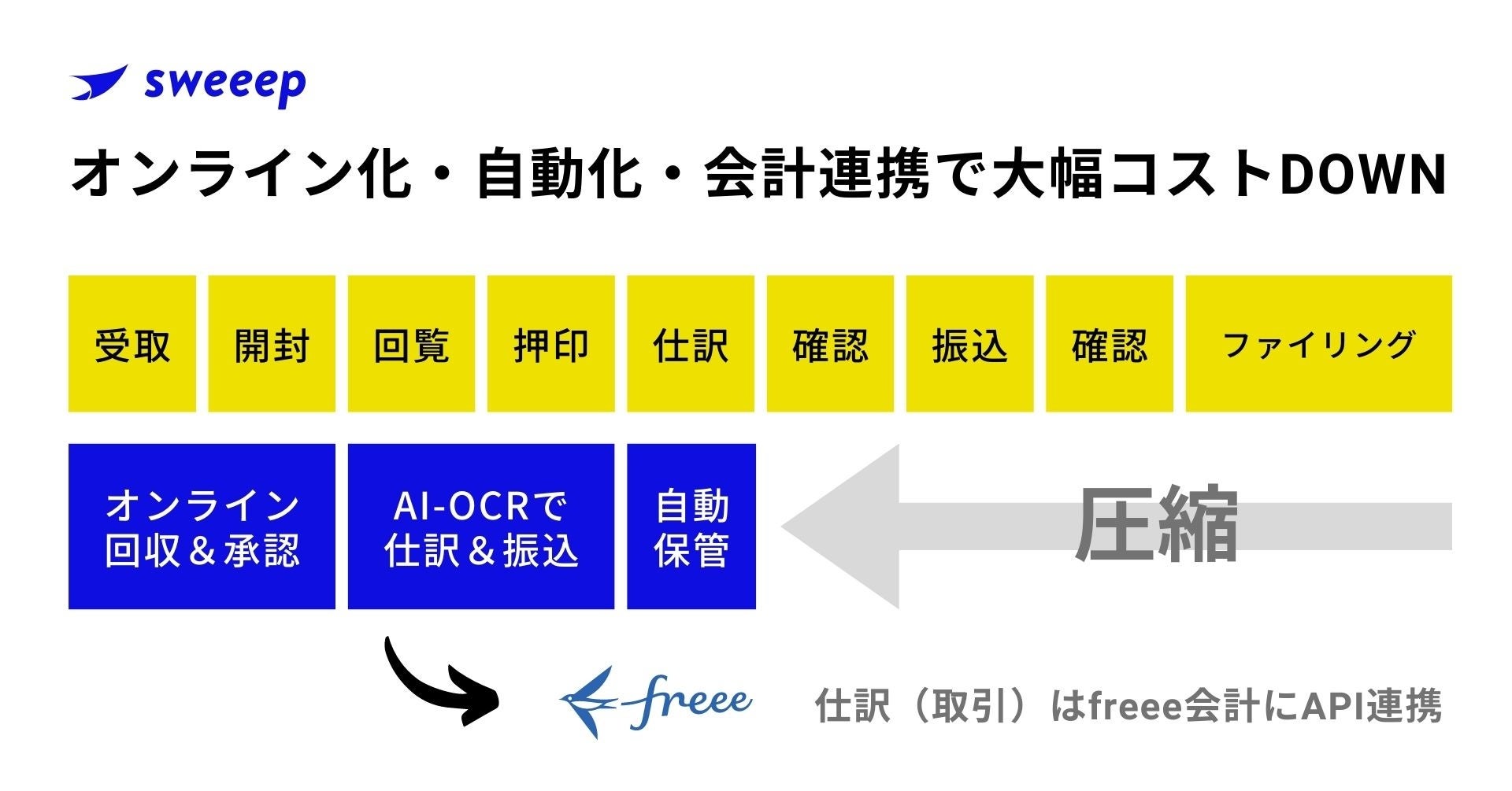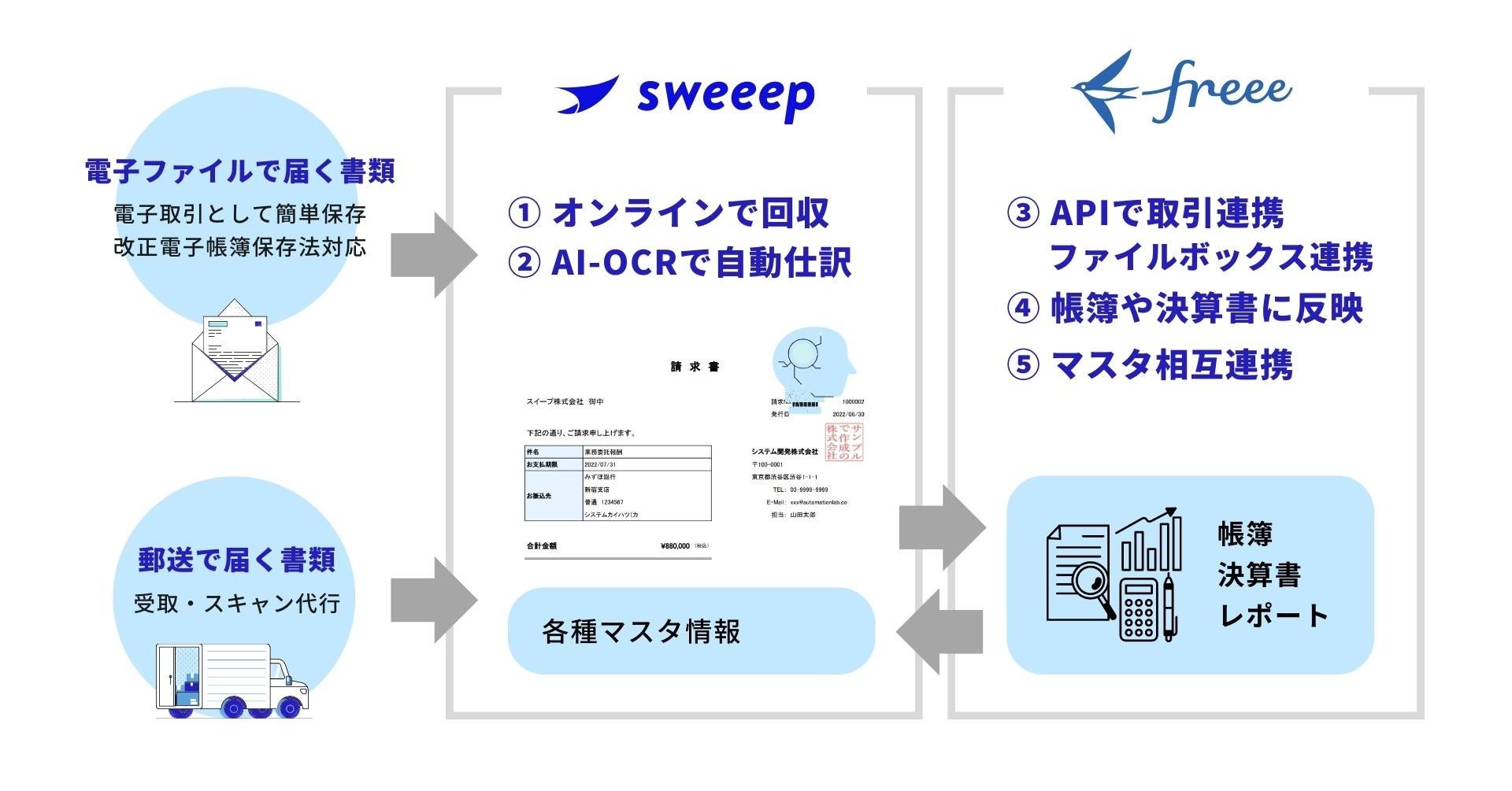 本取り組みにより、「sweeep Invoice」で受領した請求書の取引データをfreee会計に連携することができます。手入力で仕訳や振込情報の登録をする必要がなくなり、経理業務にかかる一連のプロセスをシームレスにデジタル化することが可能になります。