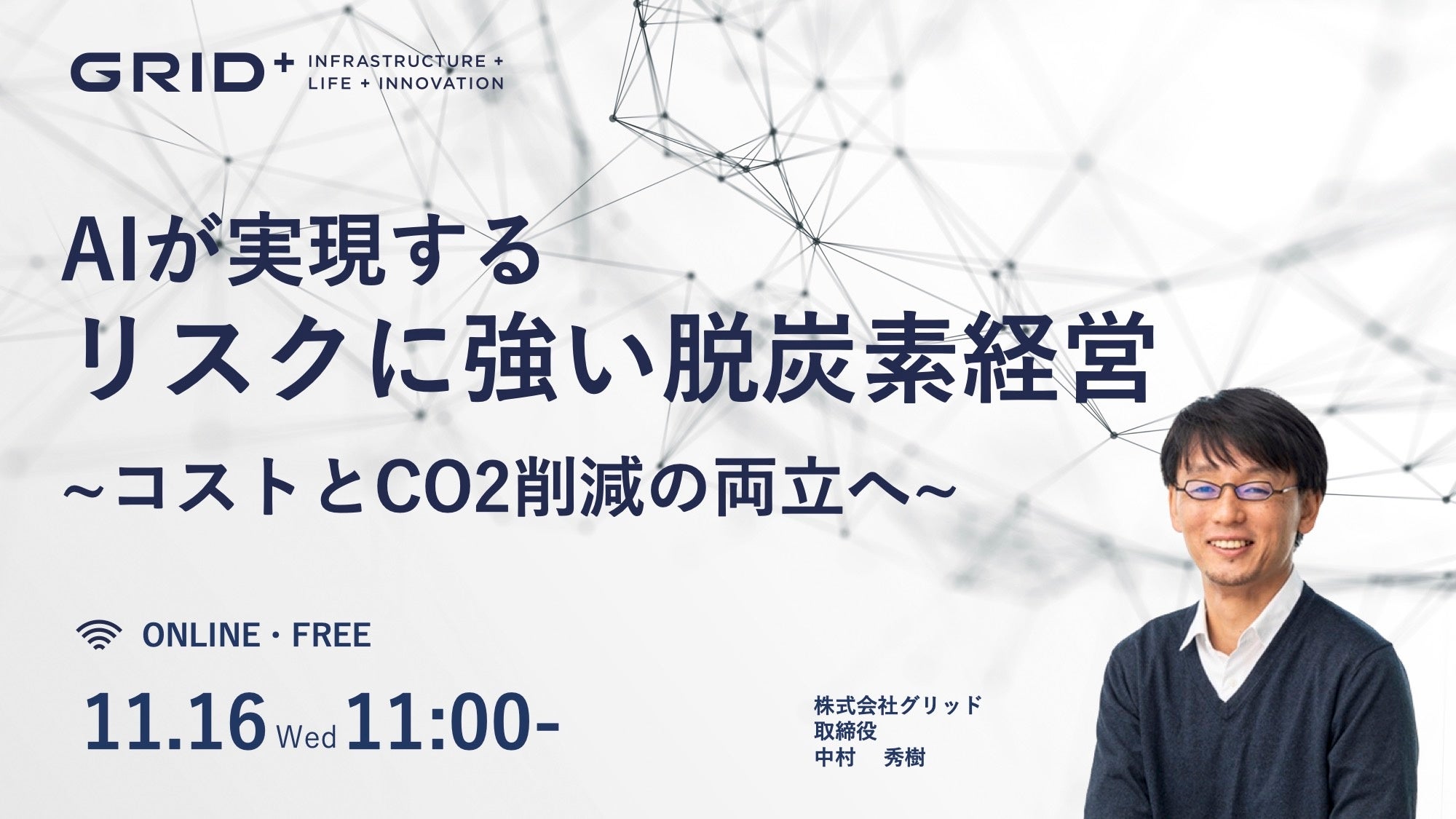 株式会社グリッドは、「AIが実現するリスクに強い脱炭素経営 〜コストとCO2削減の両立へ〜」をテーマにしたウェビナーを2022年11月16日(水)に開催することをお知らせ致します。