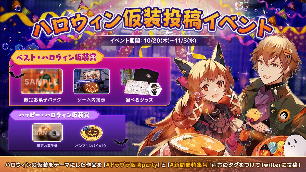 ドラブラのハロウィンをさらに楽しめるために、公式Twitterによるハロウィン仮装投稿イベントを開催しています。