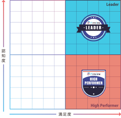 「ITreview Grid」でユーザー評価の高い2領域を表彰し、上の領域のプロダクトにはLeader バッジを発行。下の領域のプロダクトにはHigh performerバッジを発行しています。