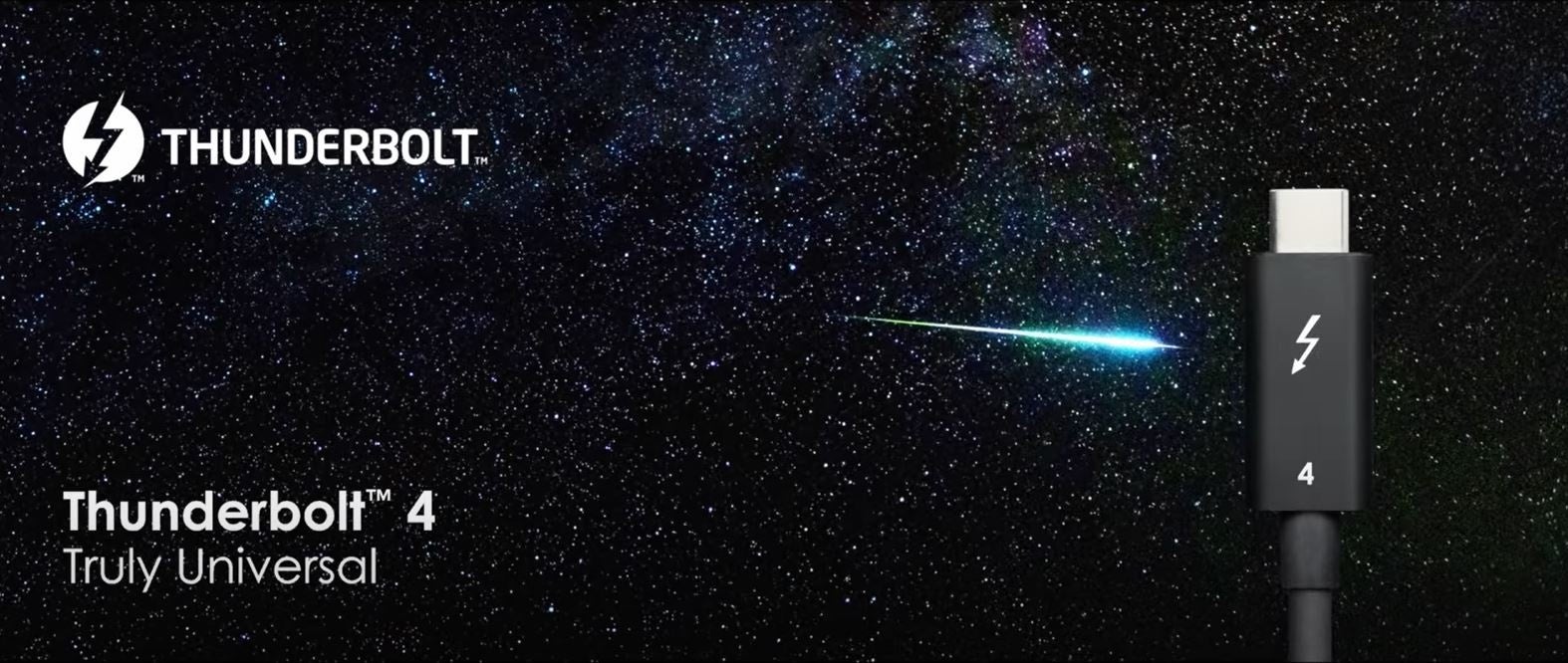 Thunderbolt™は、インテル社によって発表された次世代規格となり、近年ではPCに広く採用されている高速通信インターフェイスです。Thunderbolt™ 4は、直近の3世代のCoreプロセッサーに統合されており、データ転送と高画質映像の表示を同時に行うことができます。またThunderbolt™ 3と同じ 40Gbps の広帯域幅を持っており、以前のバージョンの Thunderbolt™、USB、DisplayPort、PCl Expressなど、多くの接続規格と互換性があります。