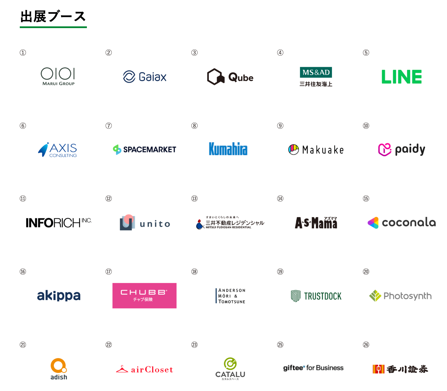 損害保険ジャパン株式会社株式会社 / 株式会社ガイアックス / 株式会社AsMama / 株式会社ココナラ / 株式会社スペースマーケット / 株式会社エアークローゼット / 株式会社マクアケ / akippa株式会社 / 株式会社 DeNA SOMPO Mobility / 株式会社アドレス