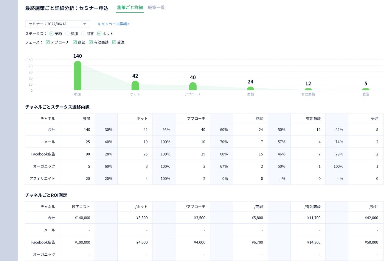 CRMやMAの専任担当者がいなくてもマーケティングから営業、受注後のデータまで一貫して管理ができ、マーケティング施策の成果がどのように売上に貢献しているのかを分析、改善できるツールとなっています。