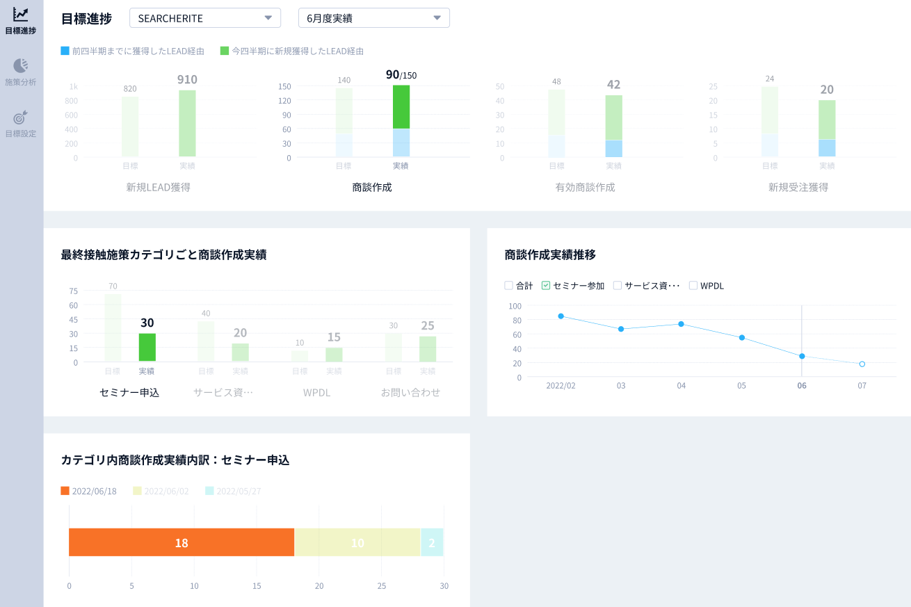 CRMやMAの専任担当者がいなくてもマーケティングから営業、受注後のデータまで一貫して管理ができ、マーケティング施策の成果がどのように売上に貢献しているのかを分析、改善できるツールとなっています。