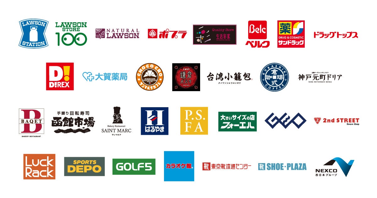 | 対象店舗 | 「ローソン」「ローソンストア100」「ナチュラルローソン」「ポプラ」「生活彩家」「ベルク」「サンドラッグ」「ドラッグトップス」「ダイレックス」「大賀薬局」「サンマルクカフェ」「鎌倉パスタ」「台湾小籠包」「倉式珈琲店」「神戸元町ドリア」「バケット」「函館市場」「ベーカリーレストランサンマルク」「ベーカリーサンマルク」「サンマルクカフェ+R」「ぎをん椿庵」「石焼炒飯店」「ビストロ309」「ブレッドガーデン」「パントリエ」「ブレッドバイキング」「プレミアムバゲット」「宝田水産」「横濱元町ドリア」「チーズ&ドリア,スイーツ」「グリル蔵敷」「ハイチーズ」「ファーマーズキッチン」「ザシーズン」「奥出雲玄米食堂井上」「はるやま」「P.S.FA」「フォーエル」「ゲオ」「セカンドストリート」「ラックラック」「スポーツデポ」「ゴルフ5」「ゴルフ5プレステージ」「アルペンアウトドアーズフラッグシップ」「アルペンアウトドアーズ」「アルペンマウンテンズ」「ティゴラ バイ スポーツデポ」「Alpen TOKYO」「カラオケ館」「東京靴流通センター」「シュープラザ」「NEXCO西日本SA・PA」 ※一部対象外の店舗があります。 |