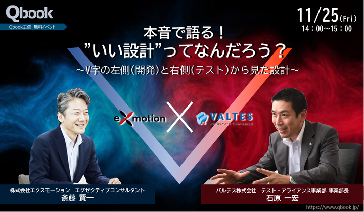 今回、エクスモーション社の斎藤賢一氏をお招きし、テスト専門会社のバルテス株式会社の石原一宏とのトーク形式で「いい設計」とは何かについて、開発側、テスト側からのそれぞれの観点から紐解いてみたいと思います。