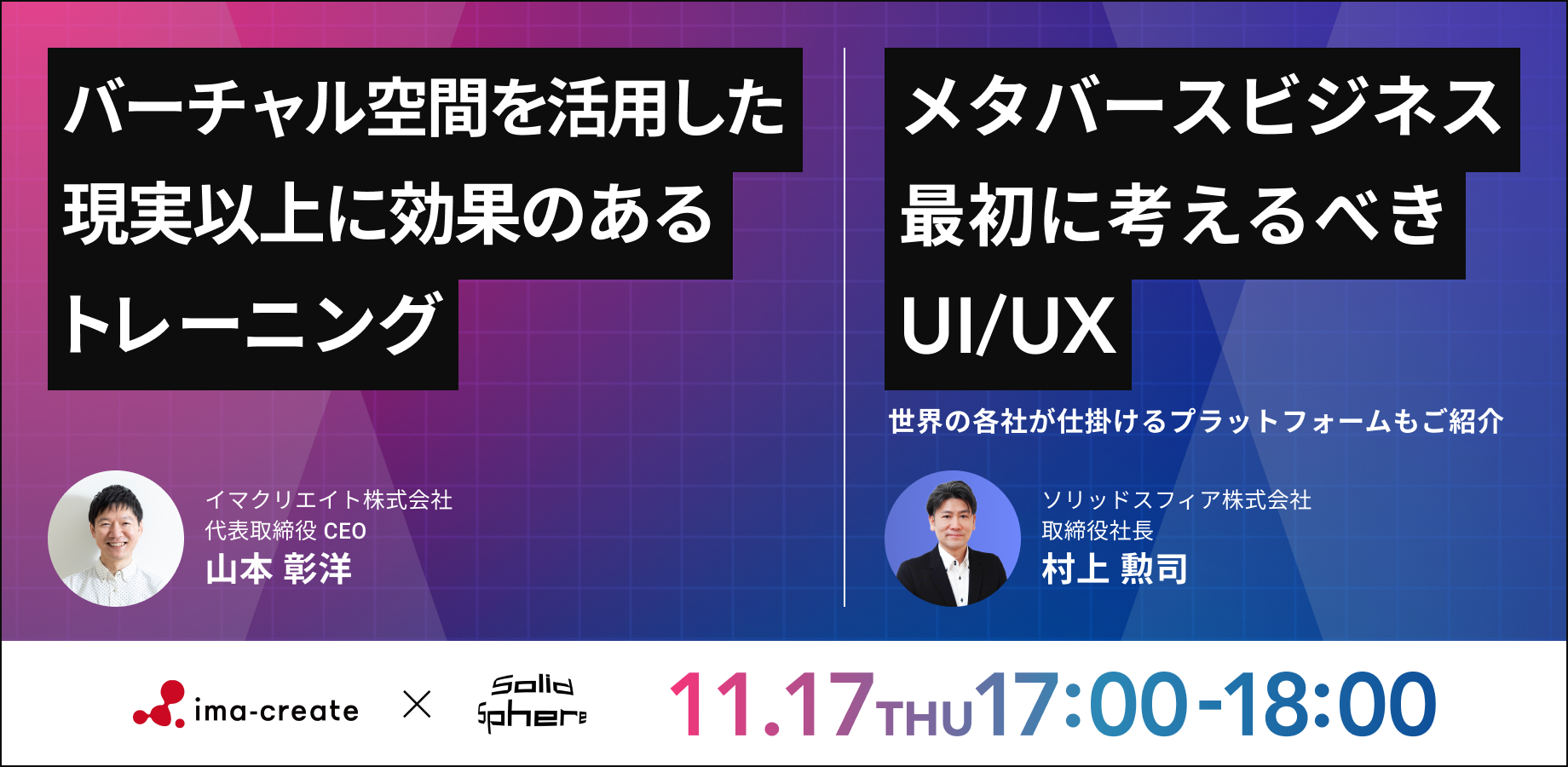 本セミナーでは、3つのパートでメタバースに関するコンテンツを提供いたします。まず1つ目に、メタバースとは何か、今世界の各社がどのようなプラットフォーム展開をしておりどんな特徴があるのか、独自調査したものをご紹介します。2つ目は、ゲストスピーカーにイマクリエイト株式会社 代表取締役 CEOの山本氏をお迎えし、同社の仕掛ける「バーチャル空間だからこそ現実以上に効果のあるトレーニング」をテーマにお話頂きます。3つ目のパートでは、当社が考えるメタバースビジネスで最初に考えるべきUI/UXについてお話させていただきます。