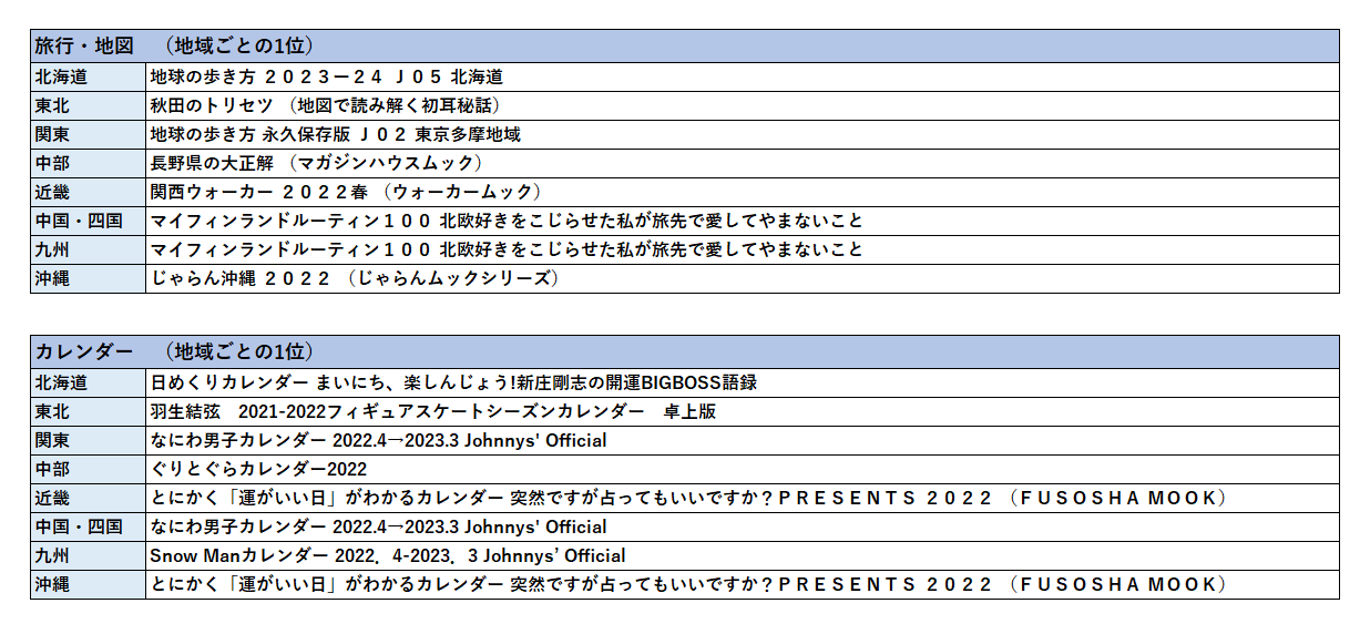 また、ジャンル「カレンダー」では『日めくりカレンダー まいにち、楽しんじょう!新庄剛志の開運BIGBOSS語録』(北海道)、『羽生結弦 2021-2022フィギュアスケートシーズンカレンダー 卓上版』(東北)などが1位を獲得しており、地域ゆかりの強さが見て取れます。「カレンダー」は北海道と沖縄を除くすべての地域で『なにわ男子カレンダー 2022.4→2023.3 Johnnys’ Official』がトップ5中にランクインしており、人気の高さがうかがえる結果となりました。
