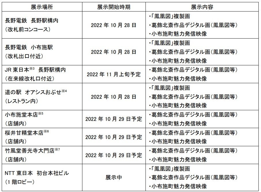 小布施町岩松院本堂※1の天井に描かれた葛飾北斎の「鳳凰図」のデジタルデータ※2等を活用し、長野県内各所およびNTT東日本初台本社ビルにて「鳳凰図」の複製画や北斎作品のデジタル画を展示します。併せて、小布施町の街並みや観光名所等の魅力を伝える映像をサイネージ等で放映します。
