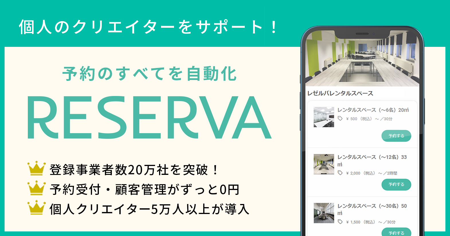RESERVAは、美容・理容・ヨガ・フィットネス・音楽・料理・キャリア・育児・占いなど350業種以上の個人商圏を最大化する支援を行っています。