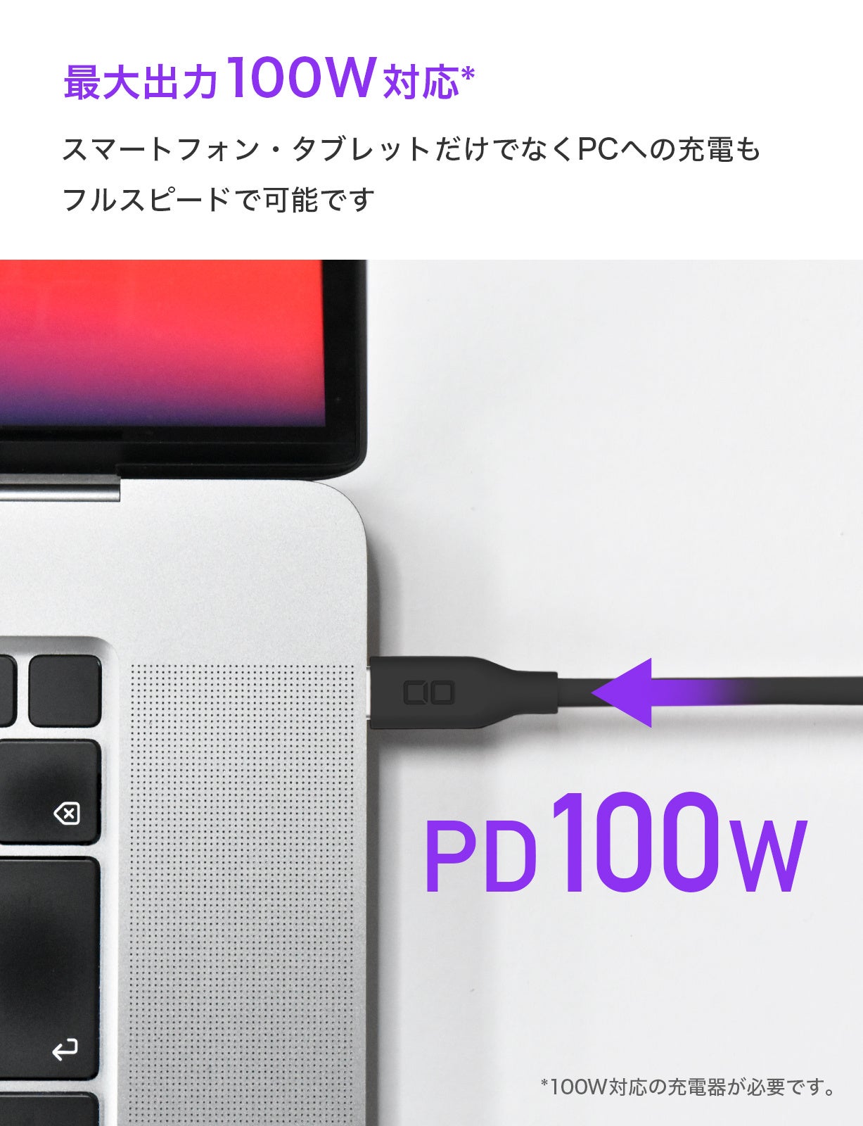 USB-C to USB-Cケーブルは最大100WのPD充電に対応。スマートフォンのみならずPD対応パソコンやタブレットなどでもご使用いただけます。