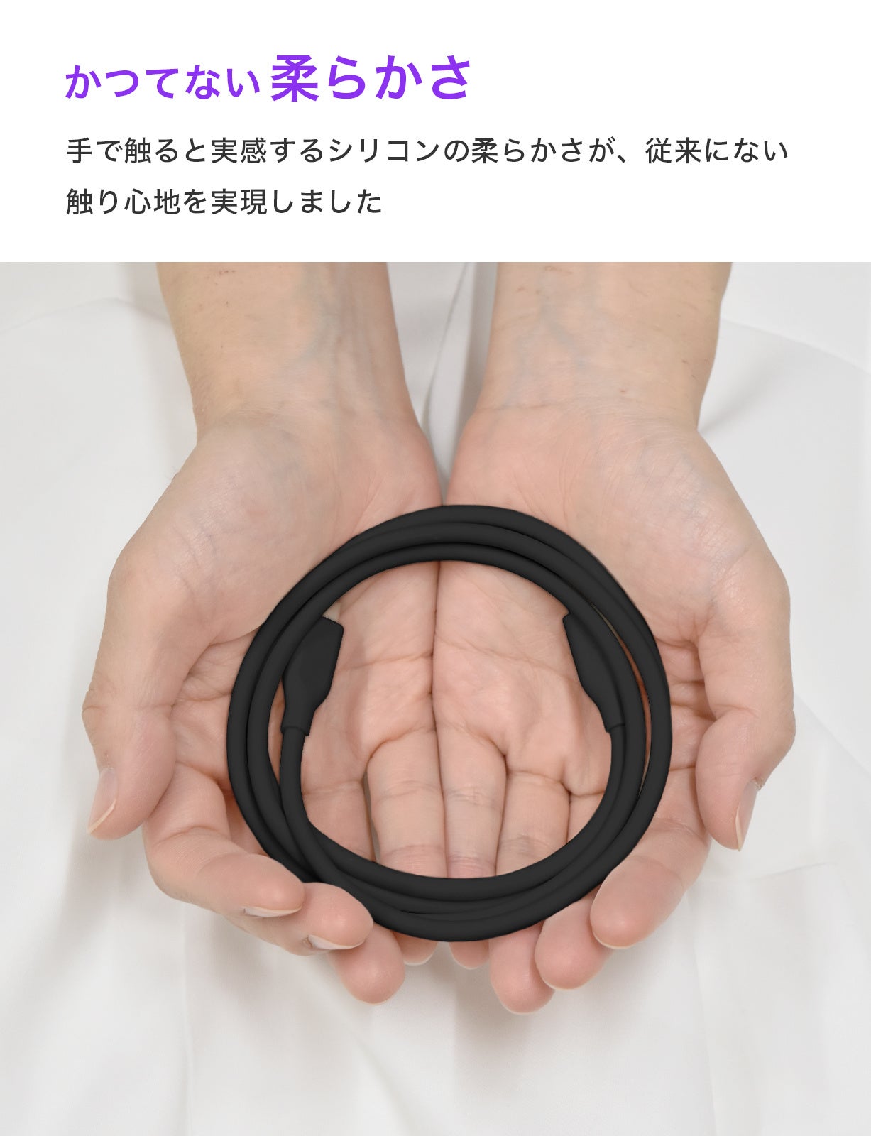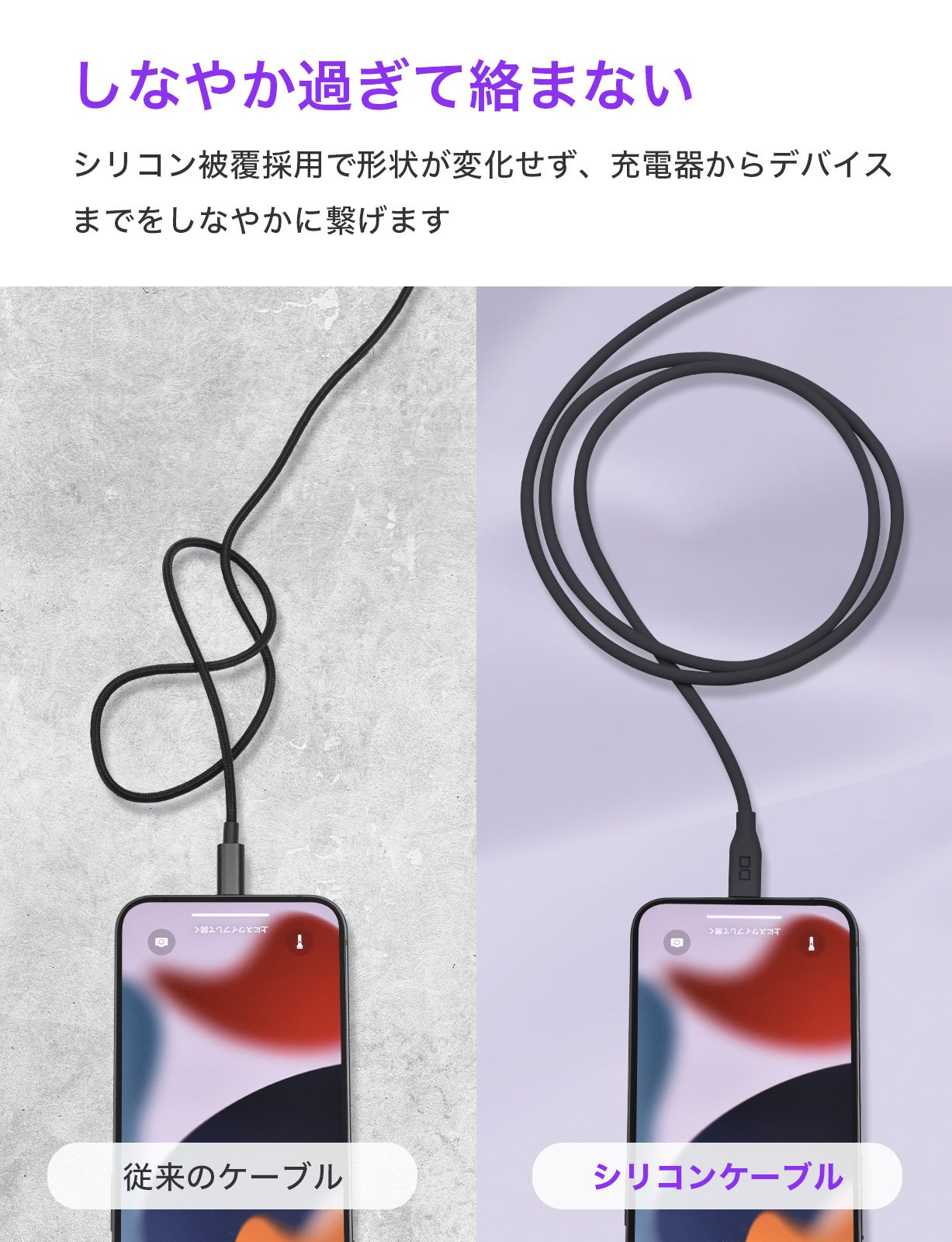 ケーブル被覆に柔軟性のあるシリコン素材を採用。しなやかで絡みづらいので使い心地・収納性にも優れます。心地よい肌触りで癖がつきにくいので、各デバイスの充電時ケーブルの取り回しに便利です。