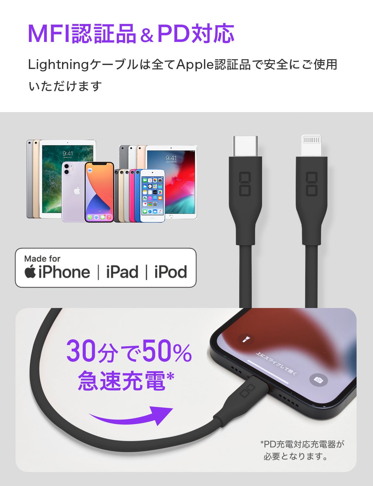Apple MFi認証を取得しているため、iPhoneやiPadなどで最適に動作し、OSのアップデート後も安心してご使用いただけます。