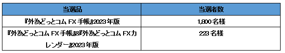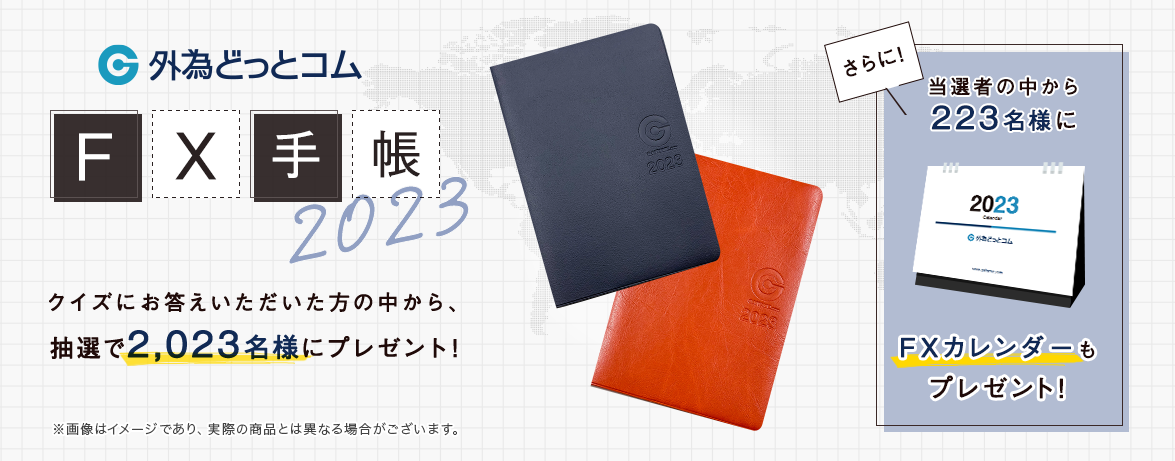 専用フォームに必要事項を入力のうえ、クイズに正解された方の中から抽選で2023名様に『外為どっとコムFX手帳』2023年版を進呈、さらに『外為どっとコムFX手帳』当選者の中から223名様に『外為どっとコムFXカレンダー』2023年版をプレゼントいたします。