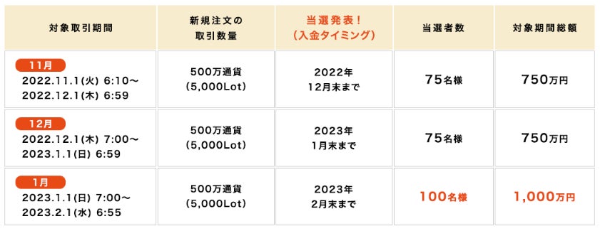 対象期間内で計3回抽選を行います!各回の日程、当選者数、取引条件は下記のとおりです。