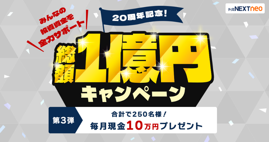 対象期間中にエントリーされ、かつ『外貨ネクストネオ』で通貨ペア・取引チャネル等を問わず1ヵ月間に500万通貨(5,000Lot)以上の新規注文のお取引をされたお客様の中から、合計で250名様に現金100,000円をプレゼントいたします。