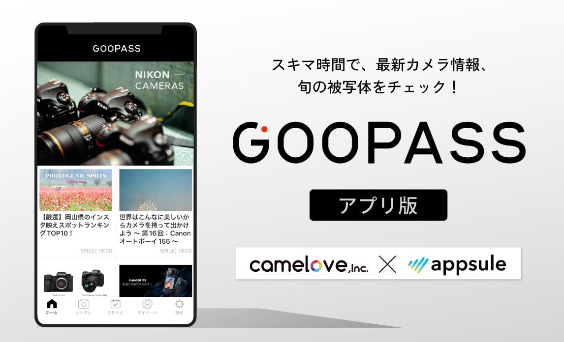 アプセルでは「オウンドアプリをもっと簡単に」を掲げ、創業から8年、ニュースメディア、ECストア・Shopify導入企業や人材会社、チケット・宿泊といった予約サービスなど多くの企業に導入いただきました。この度はこれまでのノウハウを活かし、カメラブ株式会社様(以下カメラブ)公式アプリ「GOOPASS」を制作。カメラ好きの方へ向けた情報発信はもちろん、GOOPASSを利用してカメラと交換レンズのレンタルを行う方への情報発信・クーポン配信など、カメラファンやサービス利用者と繋がるアプリ制作・運営を行っています。