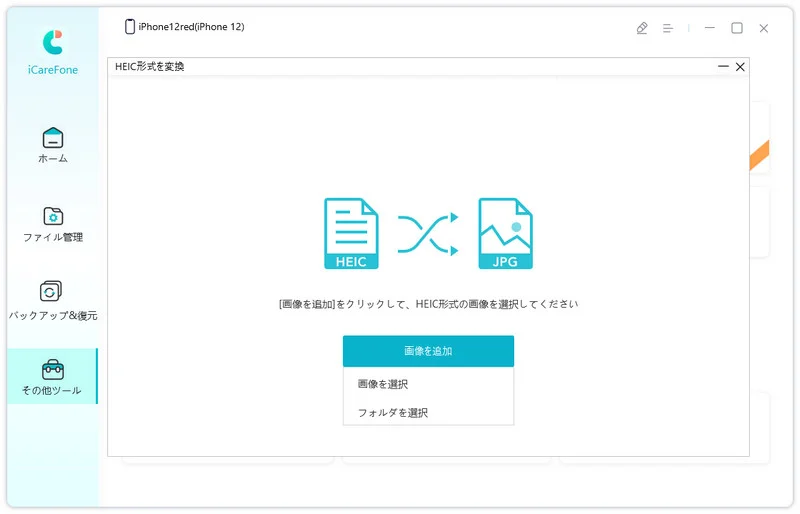 STEP3:「画像を追加」を選択し、「画像を選択」または「フォルダを選択」をクリックして、HEIC写真を追加します。