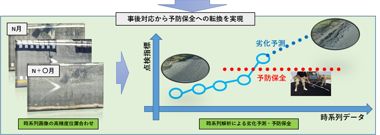 さらに、パトロールで収集した高品質な時系列路面画像を解析することで、ひび割れの進展やポットホールの発生を早期予測する手法も開発しています。これらの新技術により、従来の事後対応型のメンテナンス(重大事故が発生してから対応するなど)から予防保全型のメンテナンスへ転換し、道路損傷による瑕疵事故を未然に予防するほか、LCCの観点から維持管理費用の最適化にも貢献していきます。