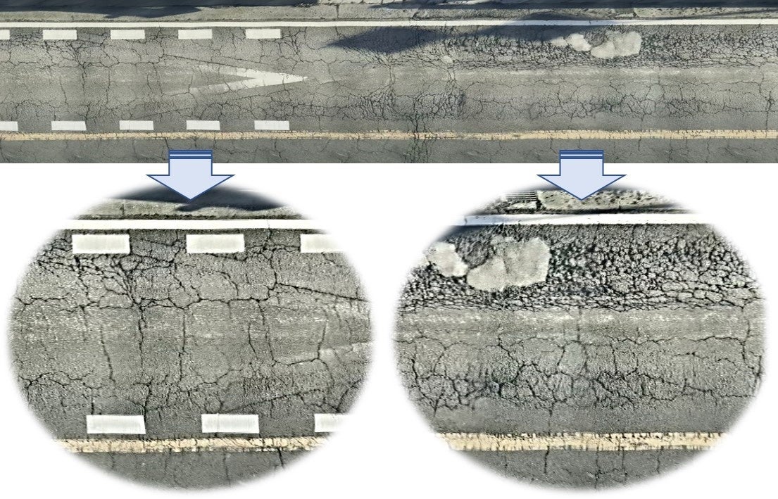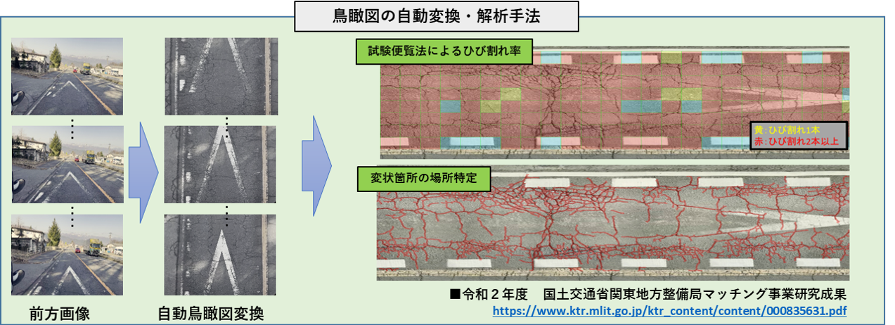 鳥瞰図変換から取得した路面の連続展開図に、機械学習処理を適用することで、ひび割れ率を「舗装調査・試験法便覧」に準拠して評価することができます。そのコア技術は、令和2 年度関東地方整備局のマッチング事業を通じて開発した成果です(研究テーマ:車両内設置カメラを利用した準リアルタイム広域路面ひび割れ率評価技術の開発)。