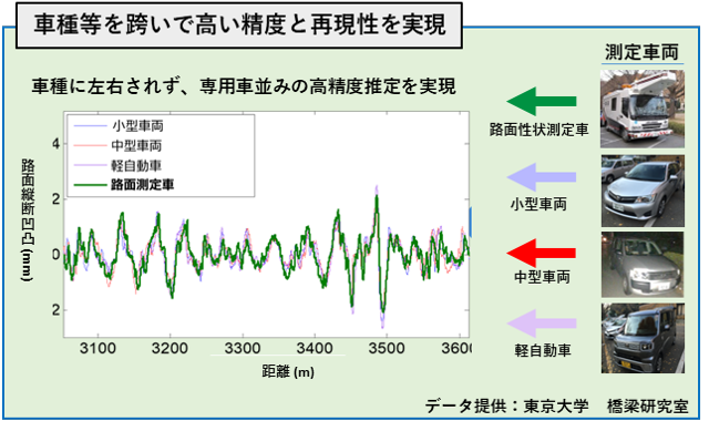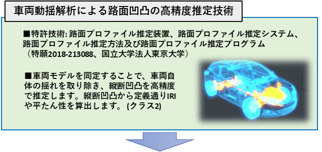 車両動揺を振動理論に基づいて解析することにより、路面凹凸の管理指標であるIRIや平たん性を高精度に評価できます。同じ道路を走行したとしても、車両ごとに揺れが違います。そのため車両の動特性の違いを補正し、車種等を跨いで高い精度と再現性でIRIや平たん性を求める技術が必要です。そこで、鍵を握るのが車両モデルの同定技術です。「GLOCAL-EYEZ」は東京大学が開発した特許技術を利用し、⾃由⾛⾏の際の動揺データから⾞両モデルを⾃動的に同定します(特願2018-213088)。当該特許技術はこれまで異なる車種の2台の車に搭載され性能確認試験に参加し、いずれも合格しました。