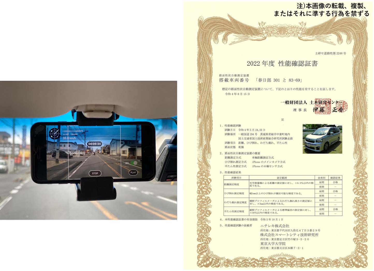 (株)スマートシティ技術研究所とニチレキ(株)が共同開発したスマートフォンによる道路点検DXシステム「GLOCAL-EYEZ」を搭載した車両が、この度、一般財団法人土木研究センター実施の「2022年度路面性状自動測定装置の性能確認試験」(以下、性能確認試験)に合格しました。「GLOCAL-EYEZ」は、一般車両にスマートフォン1台を取り付け通常通りに走行するだけで、路面性状を測定できる技術ですが、このように専用機器を必要とせずスマートフォンで完結する技術を用いた車両としては初めて、「ひび割れ」と「平たん性」の両項目で性能確認試験に合格することができました。
