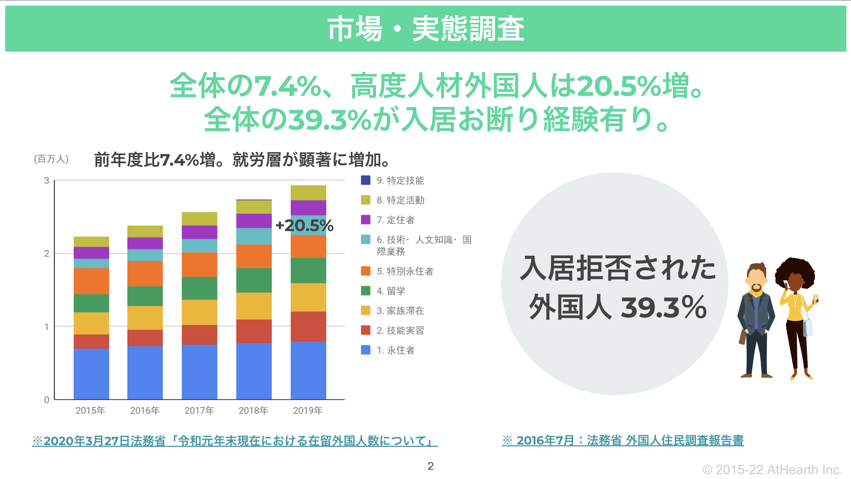 日本の国内生産労働人口が減少(※1)し、高度人材外国人が増加(※2)する中、入居拒否された経験がある外国籍の方が39.3%(※3)に上ります。