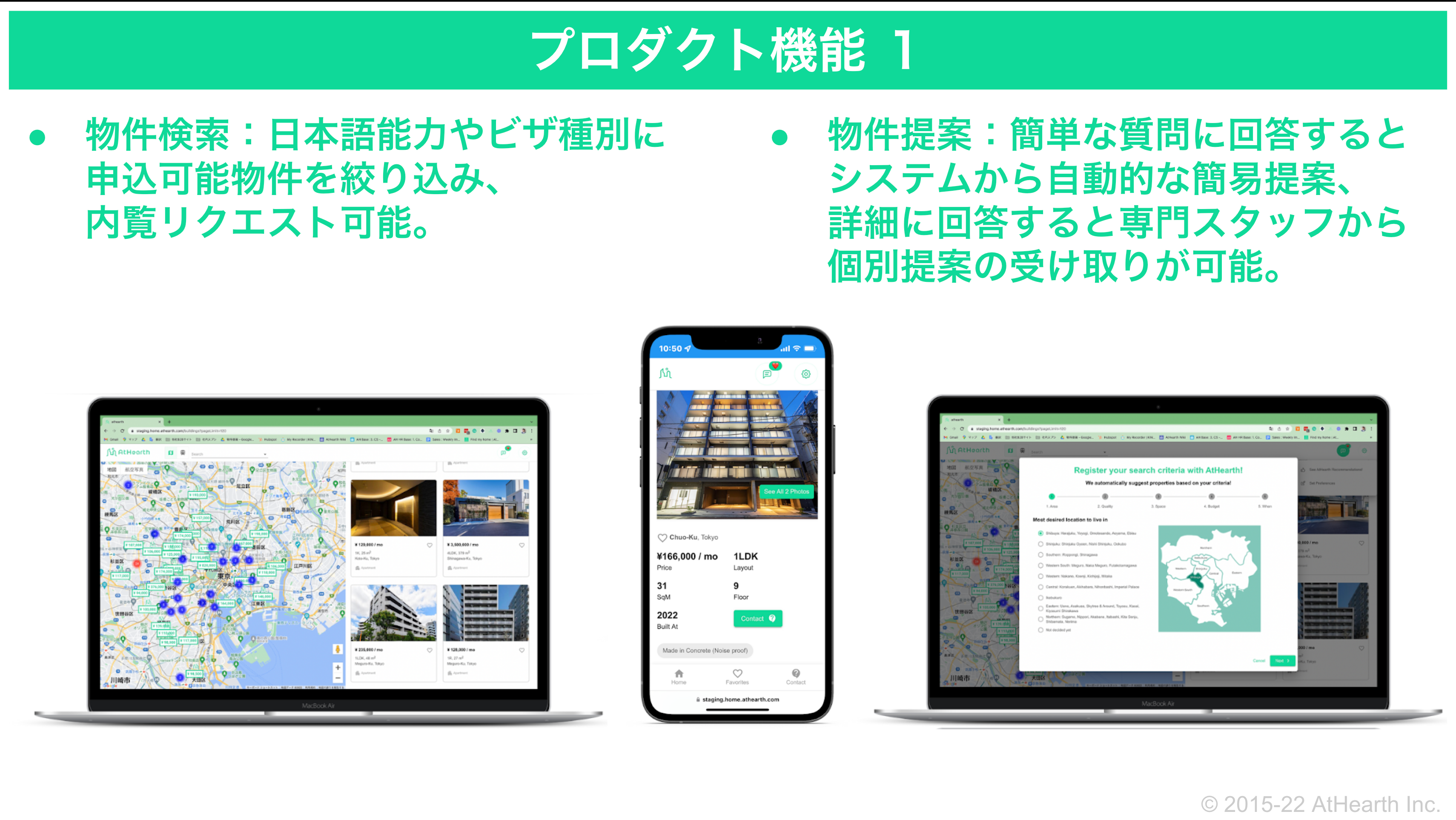 「AH Home(アットハースホーム)」は簡単な質問に答えるとカスタマーの希望するタイプの物件が提案されます。またその物件は、アットハースが独自の調査で構築した外国籍の方に有効的な物件のデータベースです。カスタマーは自身の日本語能力、ビザに合わせて審査に通る可能性が高い物件を検討することが出来ます。