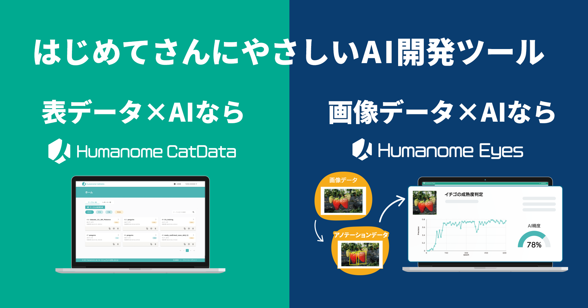 プログラミングや数式の知識がなくても、マウスだけでほぼ全ての操作が完了。お手持ちのデータで、自分だけのAIを作成することができます。表データ用の Humanome CatData、画像・動画用の Humanome Eyes の2種類を提供しております。
