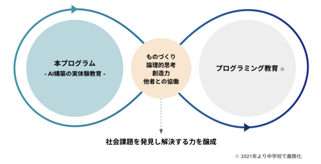 写真・数字など、多様なデータから作られるAIの活用範囲は幅広いため、本プランは教科を問わず、情報化時代で必要とされる「情報を活用する力」「疑問を持つ力」を育てるための試みとして導入いただけます。プログラミングがわからない生徒さんも、AIを文房具のように使うことで課題を解決することに集中できる内容としました。