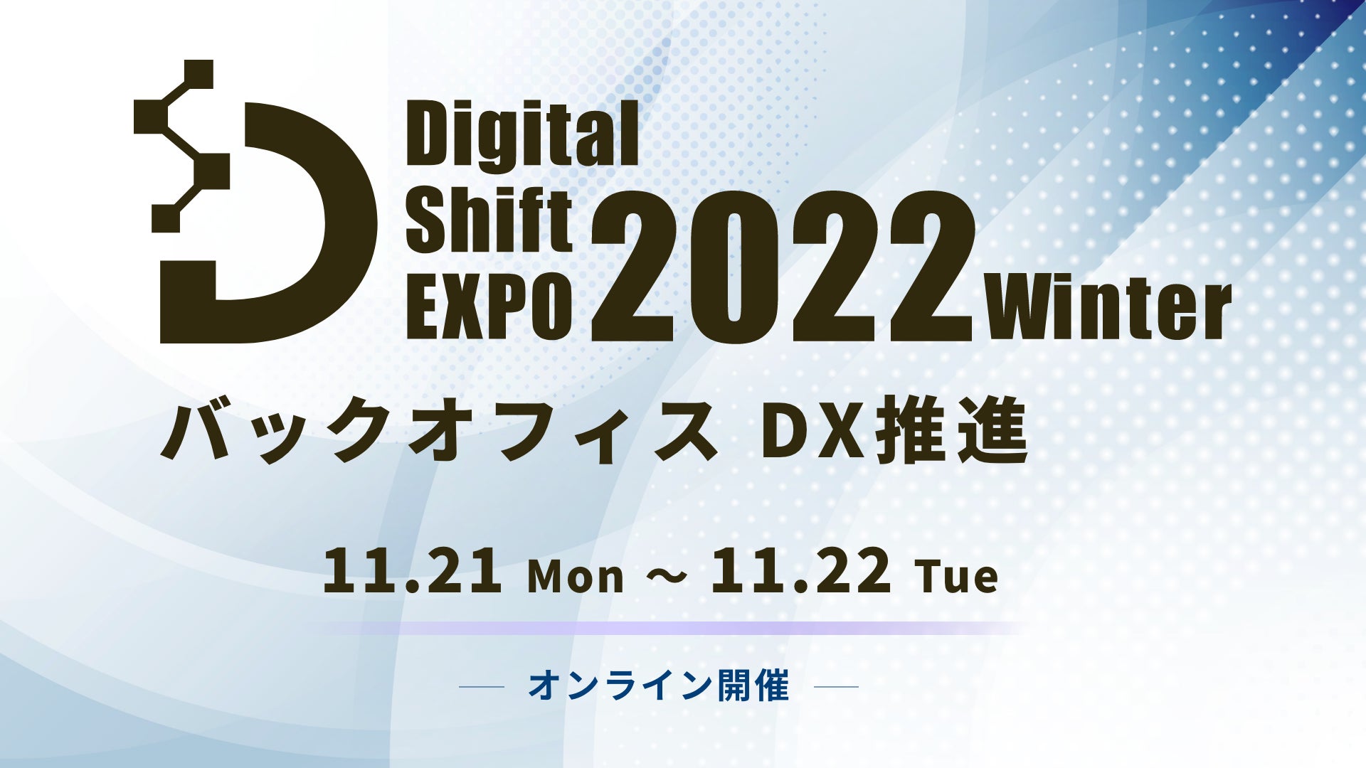 ご好評につき、第5回目を『Digital Shift EXPO 2022 Winter~バックオフィス DX推進~』として2022年11月21日(月)~22日(火)にオンライン開催いたします。