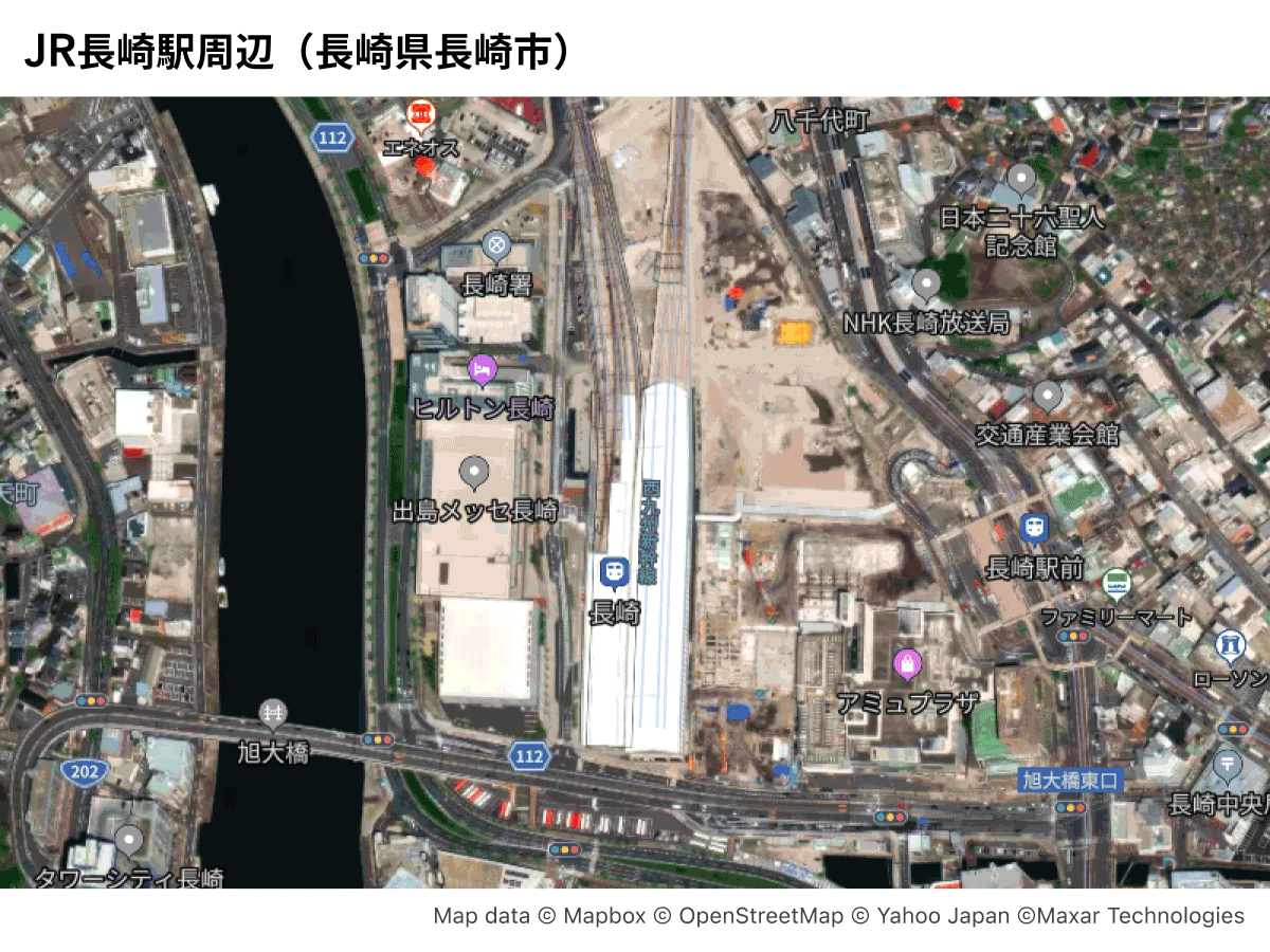 2022年9月に開業した西九州新幹線の終着駅で、北へ伸びる線路や新しくなった駅舎の形状が確認できます。