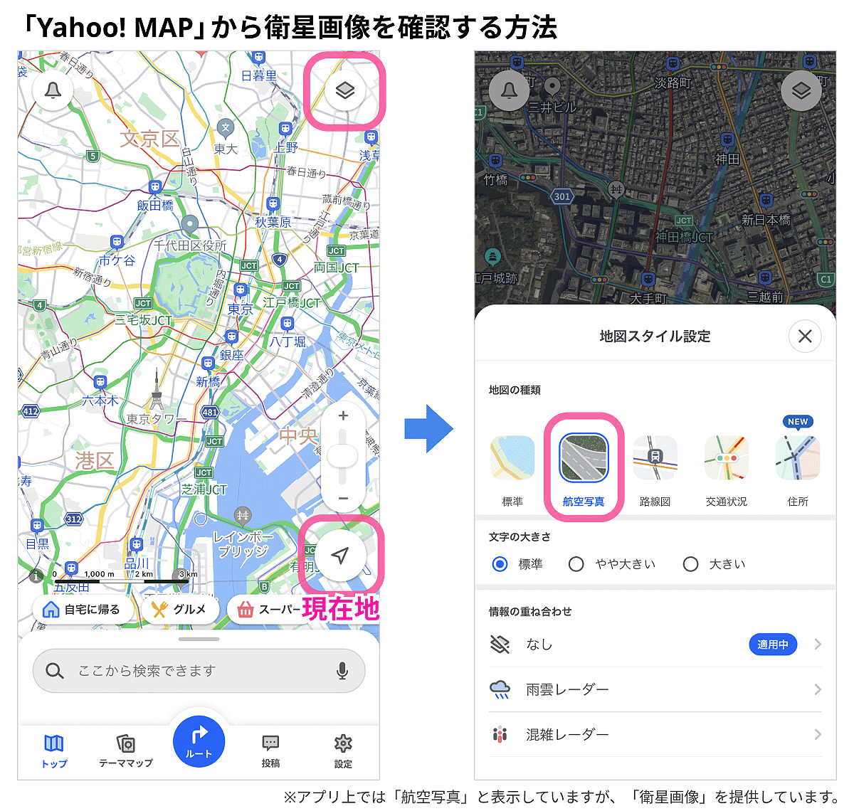 ※2:「Yahoo! MAP」上では、これまで通り「航空写真」の名称で提供しています。