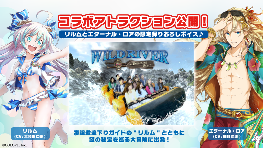 さらに、東京ジョイポリス内にあるアトラクション「ワイルドリバー ザ・トレジャーハント」とのコラボが決定しております!こちらのアトラクションは映像モニタを見ながら激流下りを体験するアトラクションとなっており、リルム(CV:大和田仁美)と、エターナル・ロア(CV:細谷佳正)の限定録りおろしボイスを使ったストーリーが楽しめます。謎の秘宝を巡る大冒険に出発しましょう!