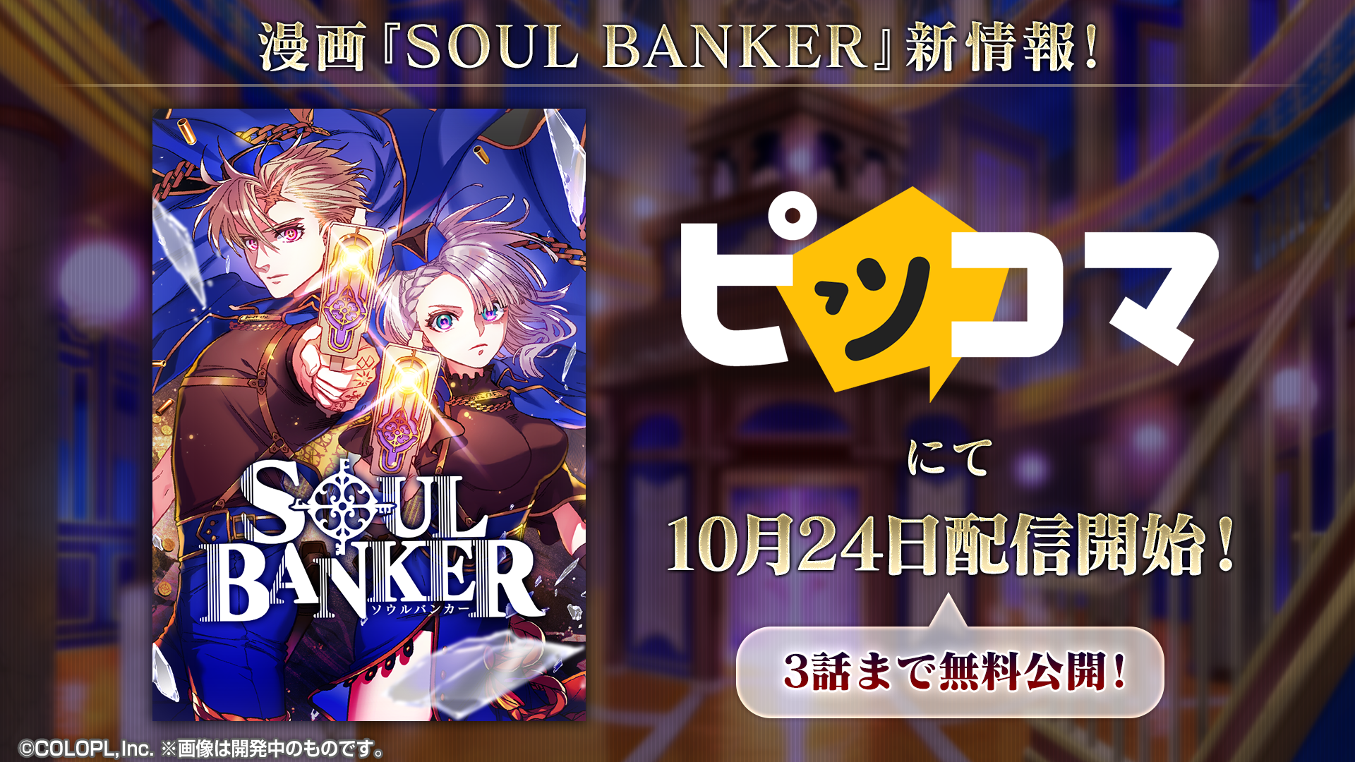 現在ゲーム内で絶賛連載中の漫画『SOUL BANKER』が、電子マンガ・ノベルサービス「ピッコマ」でも配信されております。10月24日(月)より、現在ゲーム内で連載されている話の内、1話から17話までが配信開始されております。17話以降は隔週で「ピッコマ」にて連載していく予定となっておりますので、まだ読まれていない方はぜひ読んでみてください!