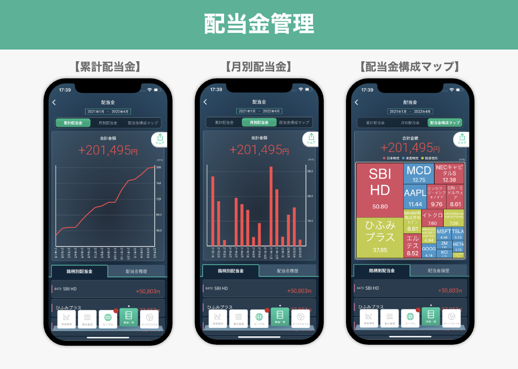 従来の、受け取った配当金を累計、月別でグラフ化する機能、時系列で一覧表示する機能に加え、今回のアップデートでは銘柄別の配当金合計表示に対応するとともに、保有する全銘柄の配当金割合のマップ化を行いました。