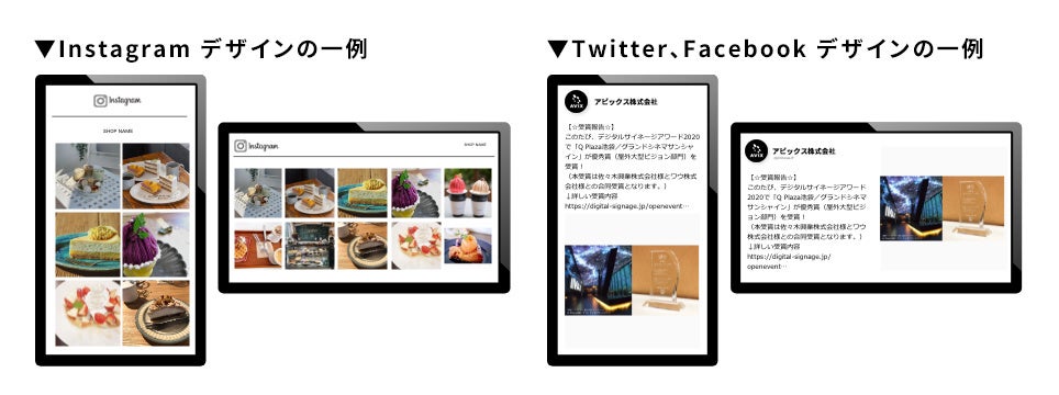 Instagram・Twitter・facebookに対応しているため、現在運用中のSNSと紐づけを行うだけで、すぐに運用を開始することができます。動画 ▶︎ SNS画面 ▶︎動画 など、設定に合わせて、画面を自動的に切り替えたり、画面分割で静止画とテキストを同時に表示することもできます。