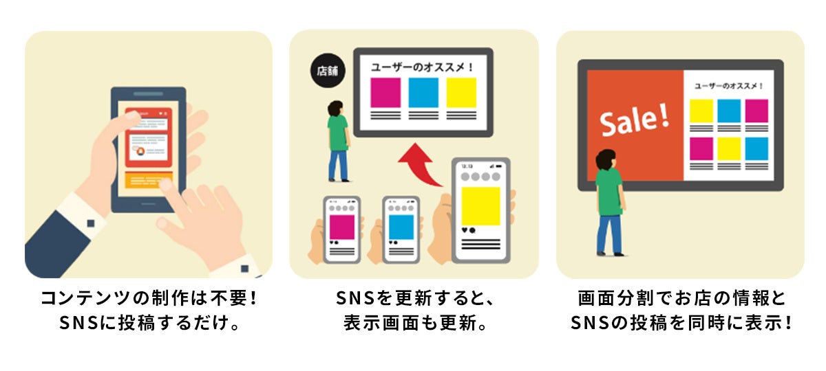 「POSUMERU -ポスメル-」を利用すれば、SNSの投稿をデジタルサイネージに自動で表示して、常に新鮮な情報を店頭に表示することが可能です。